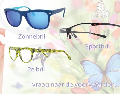 Bij een bestelling van een bril krijgt u nu een 2e paar glazen cadeau! Dat kan bijvoorbeeld zijn voor een zonnebril, sportbril of gewoon als 2e bril. Wanneer u een multifocale bril besteld zijn de gratis 2e paar glazen ook multifocaal! Vraag in de winkel naar de mogelijkheden en voorwaarden.