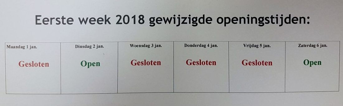 Vrijdagavond 29 december géén koopavond! Verder is de winkel de eerste week van 2018 volgens onderstaand schema geopend: